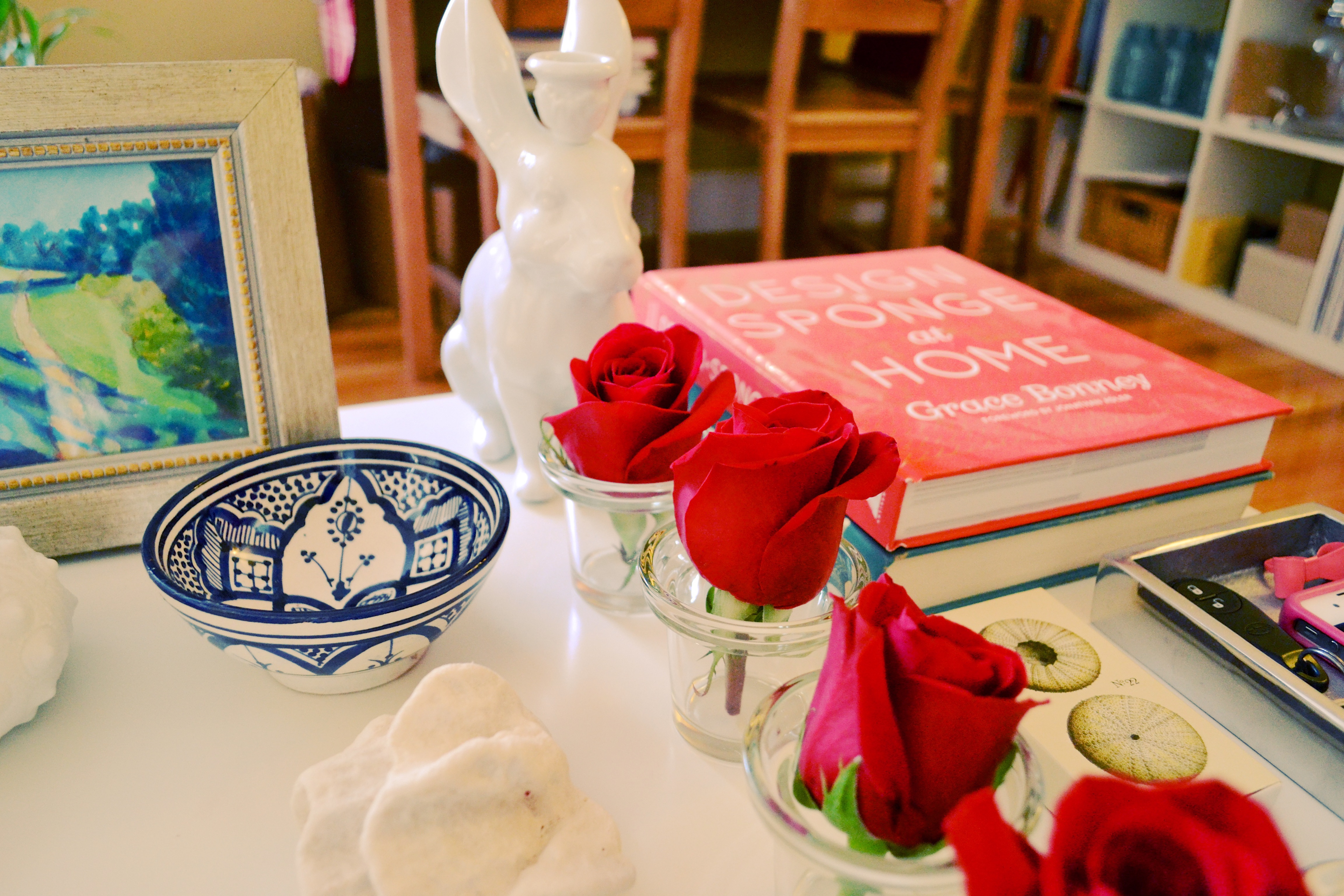Flowers: Having a vase of flowers is so cheery. I had a bouquet of red roses from my anniversary that I trimmed down and put in individual holders.