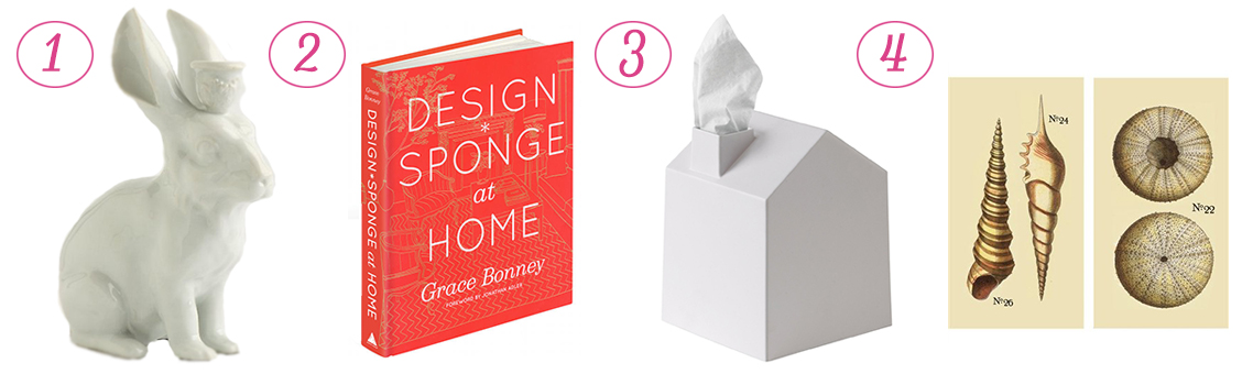 4. Rustic Rabbit Taper Holder // 2. Design Sponge at Home book // 3. Umbra Casa Tissue Box Holder // 4. Nautical Seashell Matches