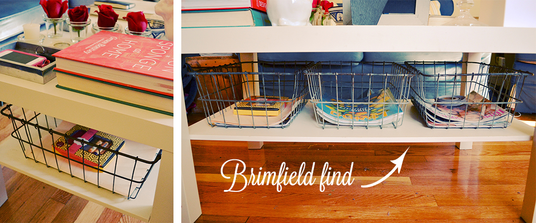 The great thing about this table is that there’s a nice storage shelf below. These wire baskets were a find from Brimfield Antique Show this past September. They fit nicely on the shelf and are the perfect size for holding magazines.