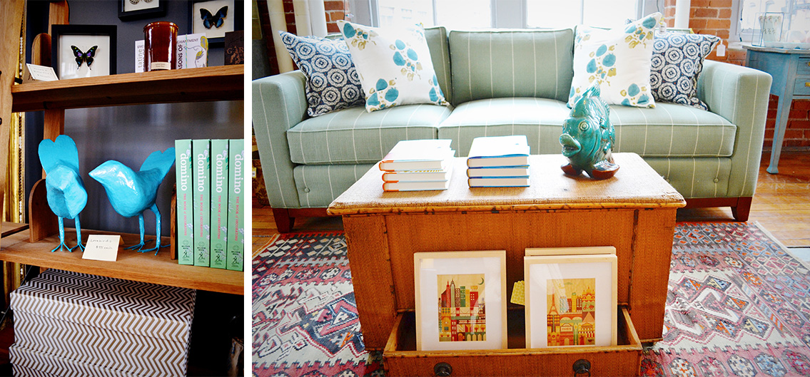 How cute is the triumphant piggy on top of the bookcase? I could definitely see myself settling in for an afternoon of reading on that cozy couch. If you’re smitten with everything in the shop and interested in creating a similar vibe, you can schedule a consultation with the ladies. They offer a full menu of design services through Twelve Chairs Studio.
