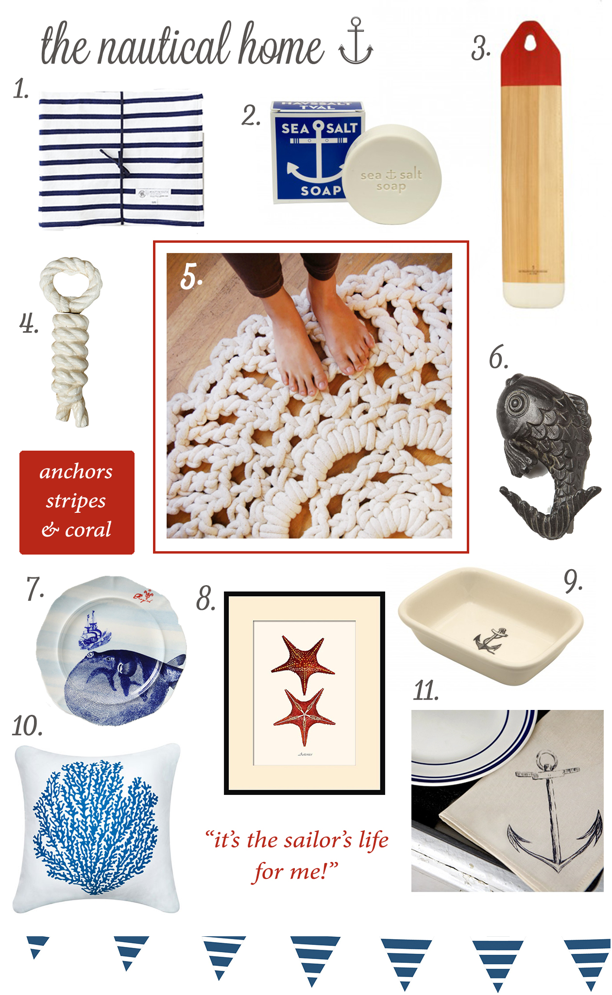 It happens every year. Several months into winter I start seriously longing for the summer sun and salt water. I’m  letting my mind wander to warmer days by compiling a board of nautical home accessories. Living in New England, it’s fun to celebrate seaside living and bringing the coastal vibe inside. Smitten with something on the board? Here’s where you can find each of the items.