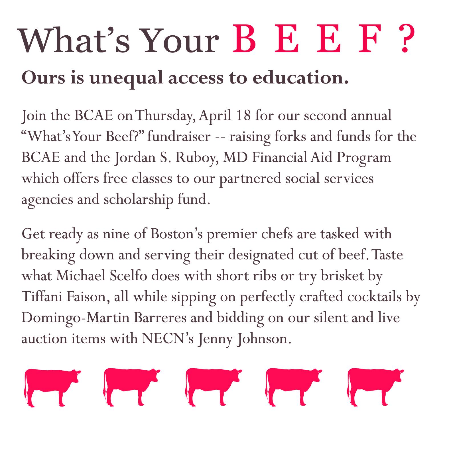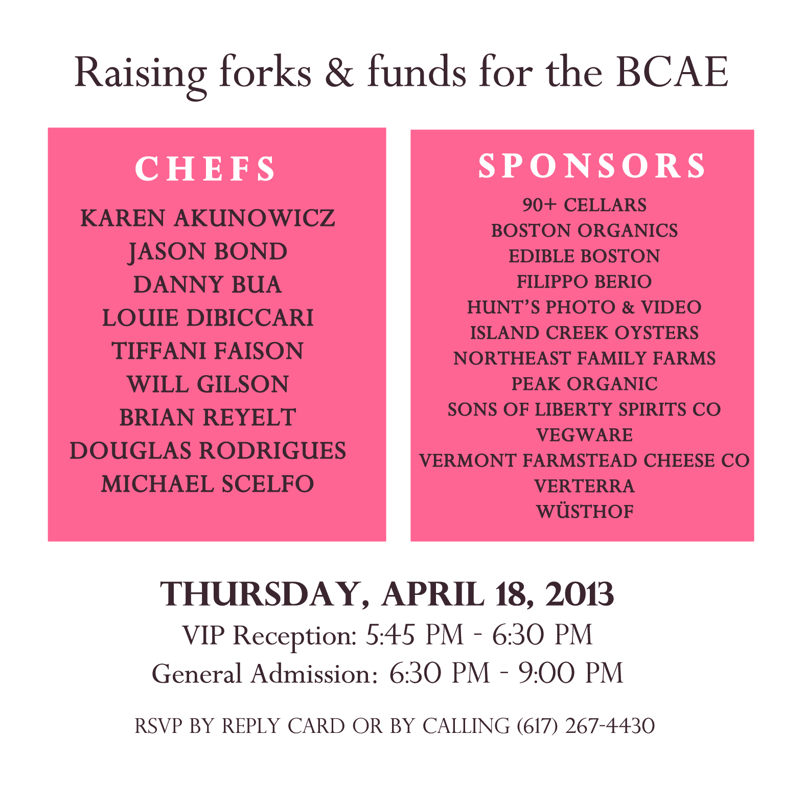 This is the BCAE’s second annual fundraiser and we have a great line-up of chefs joining us, and equally impressive sponsors contributing to the event. If last year is any indication, this a menu you don’t want to miss.