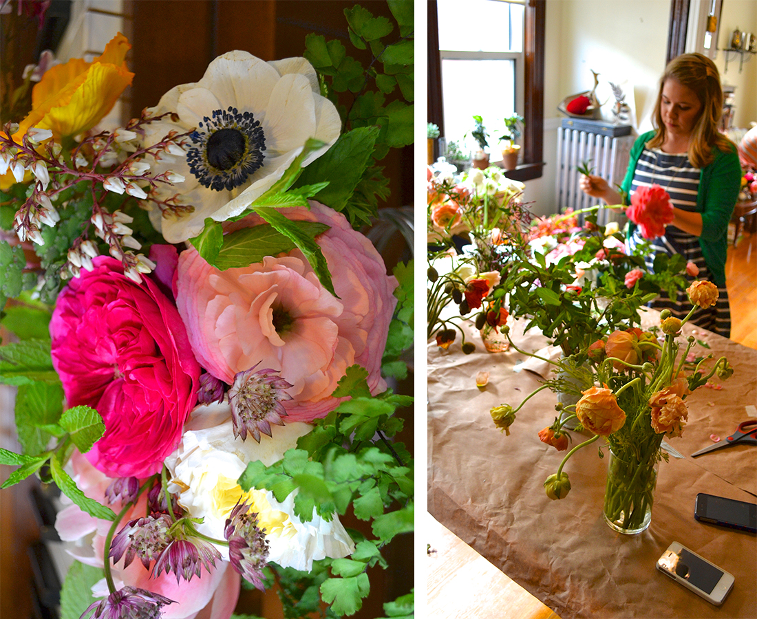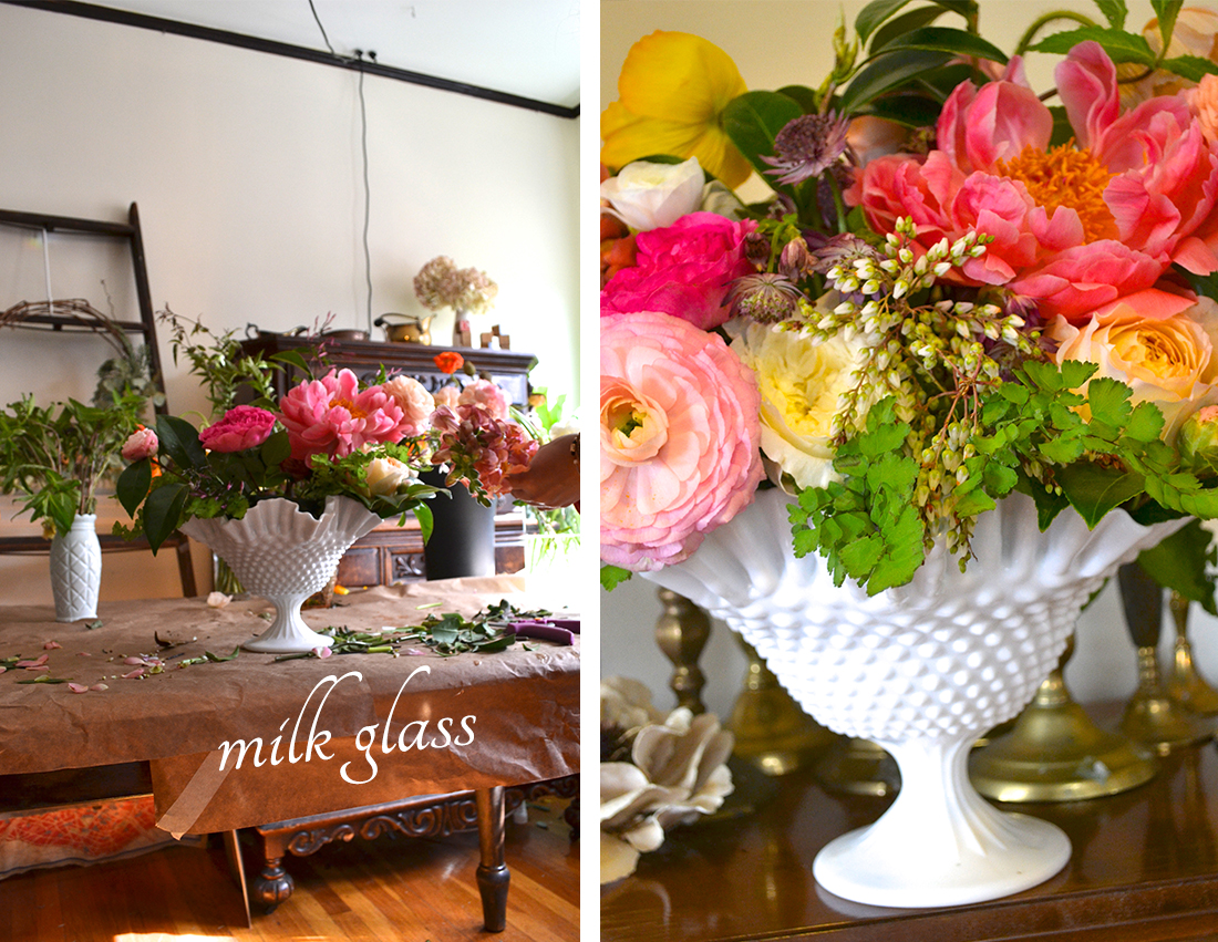 For these arrangements she included peonies, ranunculus, and anemones to name a few. One of the special things about Pollen is that Krissy takes the time to suss out unique, and oftentimes antique vessels. Right now she’s loving milk glass and predicts that mercury glass will soon be in high demand.