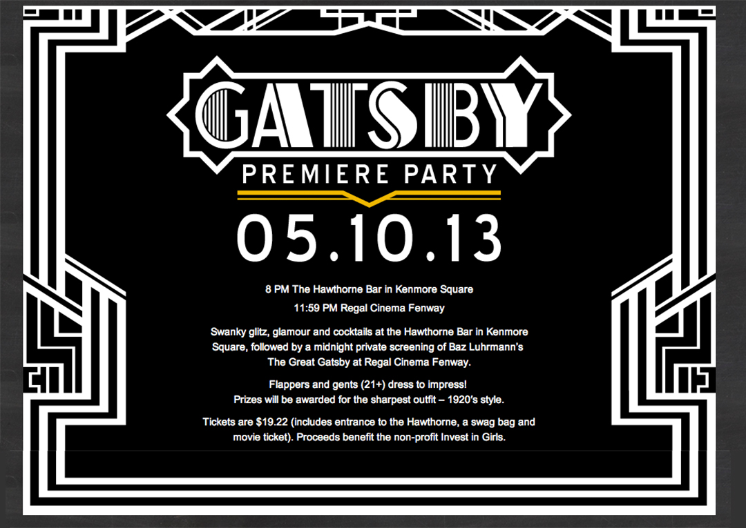 This event sounds like so much fun that I couldn’t help but share it! Wine Club Boston is putting on a premiere party that includes a swanky pre-party and private midnight showing of The Great Gatsby. Guests will start at The Hawthorne at 8:00 PM where they can enjoy several hours of mingling and cocktails and the head over to Regal Cinema (right down the street) for the movie screening. Everyone is encouraged to dress in 1920’s inspired attire!