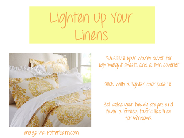 2. Great tips! My favorite is: lighten up your linens. I do this and it’s amazing how it changes the feel in the bedroom. Sometimes, I do it at the end of February because I think it will make Spring arrive sooner (no, it hasn’t worked yet!)