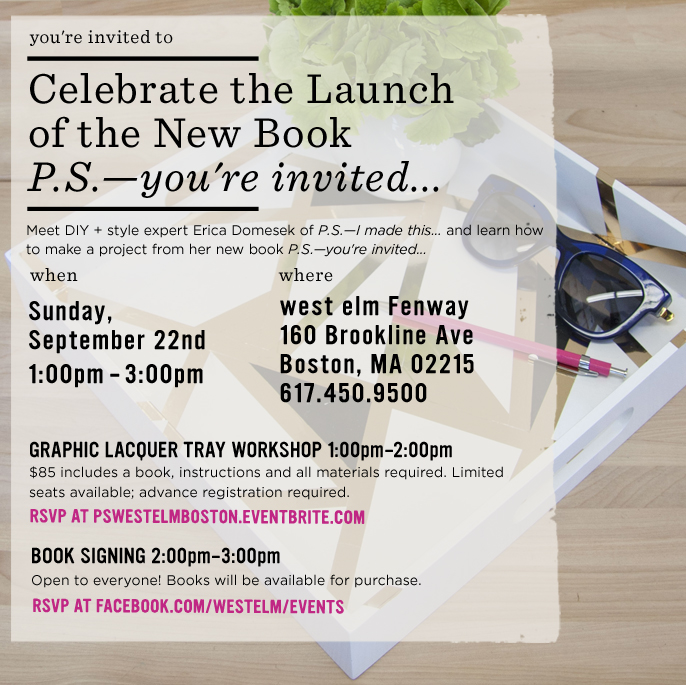 Man, there are WAY too many cool events happening in this city this month. If September is any indicator, it’s going to be a stellar event-filled fall. As you all know, I’ll be vending at The Vintage Bazaar on 9/22, but if I weren’t, I would be crafting up a storm with Erica Domesek at West Elm. You can join Erica (of P.S. I Made This) for a book signing and an hour of DIY goodness. She’ll be teaching registered participants how to craft their own lacquer tray.